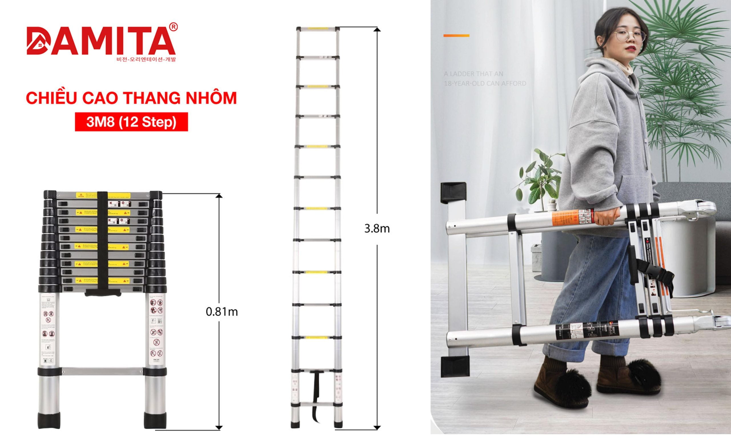 Thang Nhôm Rút DAMITA 3met2 DNS38 Cao cấp rút gọn thông minh Có Khối lượng nhẹ di chuyển dễ dàng